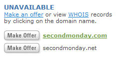 If I had to name a direct marketing company today, however, I’d be out of luck, and not just because the factoid this name was based on is no longer true. SecondMonday.com went into circulation long ago, and has been scooped up by someone else. Just like nearly every other good domain name you can imagine.