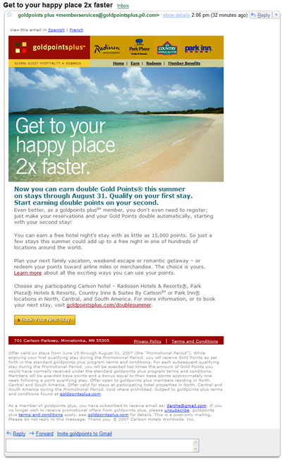 My Gmail account is set so I don’t see images embedded in emails unless I choose to, on a case-by-case basis. I just received another email today from the company that sent the one below. In both cases, I had no idea who was sending it to me, unless I remembered what company is behind the Goldpoints Plus continuity program I subscribed to ages ago (fat chance!). Can you tell me who this is? This is a screen capture of the first one I received.