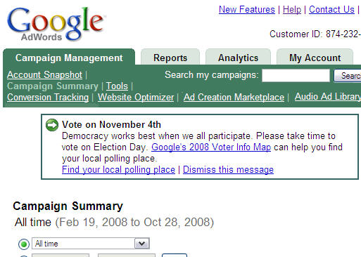 If you didn’t know there was an election tomorrow (yeah, right!), Google wishes to remind you. Amidst typical alerts on its Adwords dashboard to adjust your bids or review your budgets, they’ve posted the following: