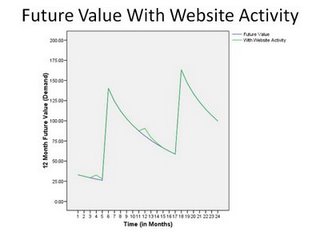 Hillstrom likens future value, as measured by non-sale visits, as “sort of like a heartbeat … each additional purchase (months six and eighteen in the graph) results in a shot of adrenaline, causing the heart to beat.