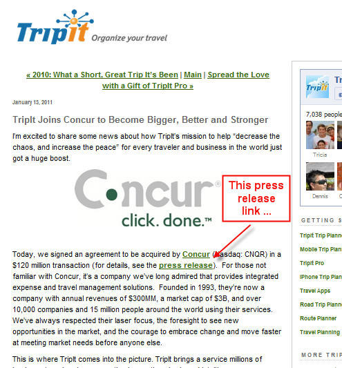Look at the headline for the blog post: “Tripit Joins Concur to Become Bigger, Better and Stronger.” It’s a lot easier, from a compliance perspective, to say this in a blog post. Journalists and the financial industry — the two groups most likely to be interested in this story — would both regard a press release using this language with some skepticism.