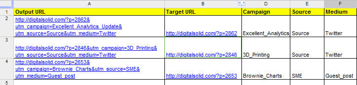 2. Before “hiding” column C, place this formula in it: =((((((((B2&IF(ISERROR(FIND(CHAR(63),B2,1)),"?","&"))&"utm_campaign=")&D7)&"&utm_source=")&E2)&"&utm_medium=")&F2)) This formula confirms that the target URL (in cell B2) does not already contain a question mark in it. If it finds one already, none will be added. If it finds no question mark, it added one. After that it builds a trailing URL string that will be familiar to those who roll their own URLs, or use Google’s URL Builder. Once you’re done you’re safe to highlight the column and hide it.