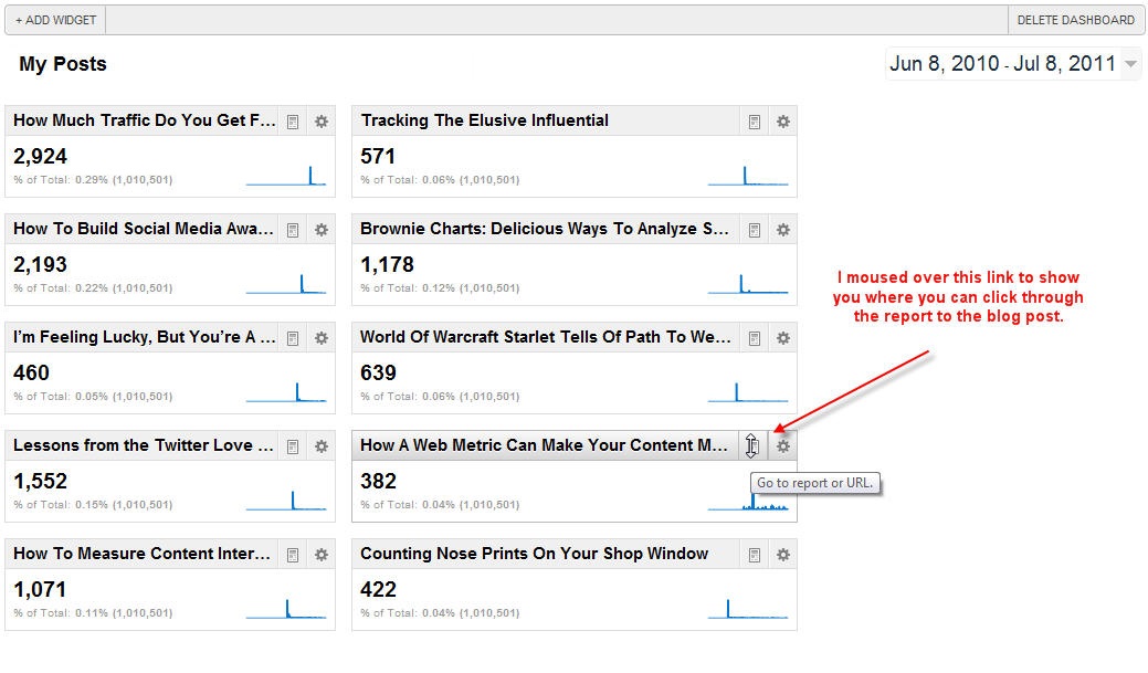 My work with Accenture has meant this blog has been silent since I joined. I’m loving my work there, by the way. But as for the central focus of this blog, I’ve been continuing to have fun in my off hours with web marketing analytics, especially using Google Analytics. If you use this app, you know they’ve launched a major upgrade of their reporting. It includes a way to create custom dashboards. Below you’ll find one small way I’ve used these new custom dashboards to save time and gain valuable insights.