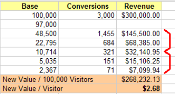 • Of those who are left [i.e., 97% of the base], 50% will visit the website again within one week, with 3% converting, spending $100 each.