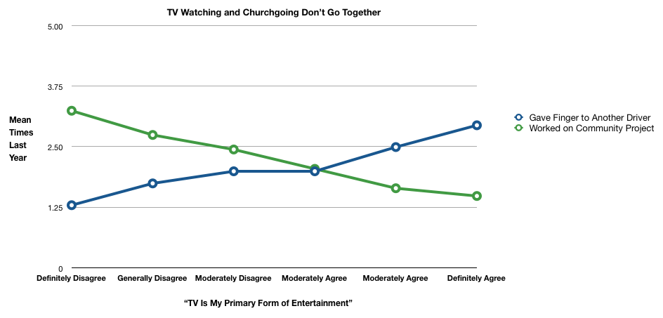It compares two self-reported activities: Participating in altruistic community events and flipping the bird to passing motorists. Here is his chart, showing the reverse correlation between contributing to what he calls “social capital” and contributing to road rage. It shows a similar direct correlation between this anti-social activity and highly valuing television. Click for a larger view, fully-legible view. (Ignore the reference to “churchgoing” in the titleby the way. It refers to additional data not shown here. It was included to help those who wish to find the entire dataset in the book’s index.)