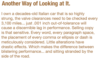 I own a decades-old Italian car that is so highly strung, the valve clearances need to be checked every 3,100 miles … just .001 inch out-of-tolerance will cause a discernible lag in performance. Selling copy is that sensitive. Every word, every paragraph space, the placement of every comma or ellipsis or dash is meticulously considered. Little alterations have drastic effects. Which makes the difference between blistering performance … and sitting stranded by the side of the road.