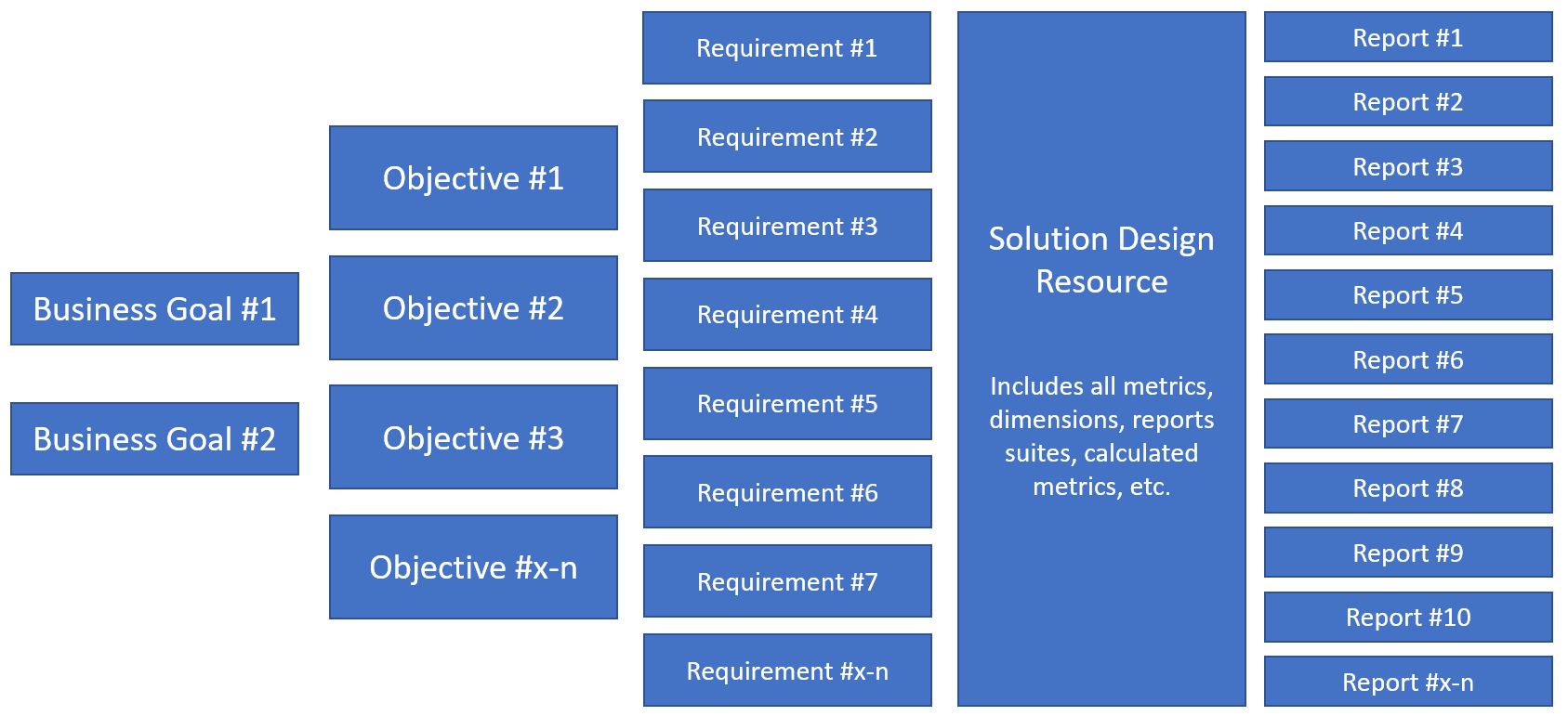 Everything following out of the Business Goals and Objectives of this Measurement Strategy value tree is prompted from you by Apollo. Keep in mind that I’ve avoided arrows in the graphic, that would typically connect boxes from one column to the next, but as you likely have guessed, there is a one-to-many relationship flowing from left to right, with all the relationships being contained and documented within the Solution Design Resource (SDR).