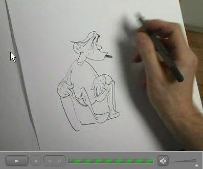 The image below is a screen capture of a featured political cartoonist at work, creating a caricature for a story. Included on the same page are links to feeds for editorial content unique to the medium — podcasts and blogs.