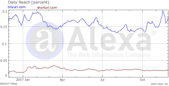 Like everything else, short URLs follow the rules of supply and demand. My first internet business, in the mid-1990’s, had a four-character dot-com domain name. Back then this was good but not extraordinary. Now the dot-com space is so crowded that many start-ups look like they were named by dipping a spoon into alphabet soup. Luckily there are short URL services — most famously ShortURL.com. [I was thinking of TinyURL.com, the clear winner of the two in terms of Alexa’s Daily Reach metric.]