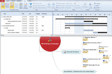 Now, the just-released MindManager 9 includes this feature. Below shows a simple Gantt chart, from MindJet’s introductory video: