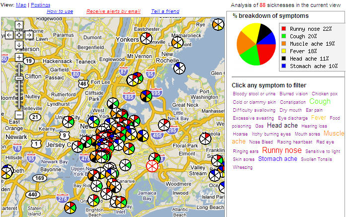 Click on this image for an expanded view of the sick people in NYC in the last 60 daysNoele is actually jumping the gun a bit. It may become a social network someday, but for now it’s a promising database / mapping application showing the spread and concentration of collections of symptoms. Participation is still quite low, but I like the concept. The image at the right shows a tag cloud of the symptoms reported in the Manhattan area. If you click on the image you’ll get an expanded view that shows the NYC Google Map with the distribution of these symptoms.